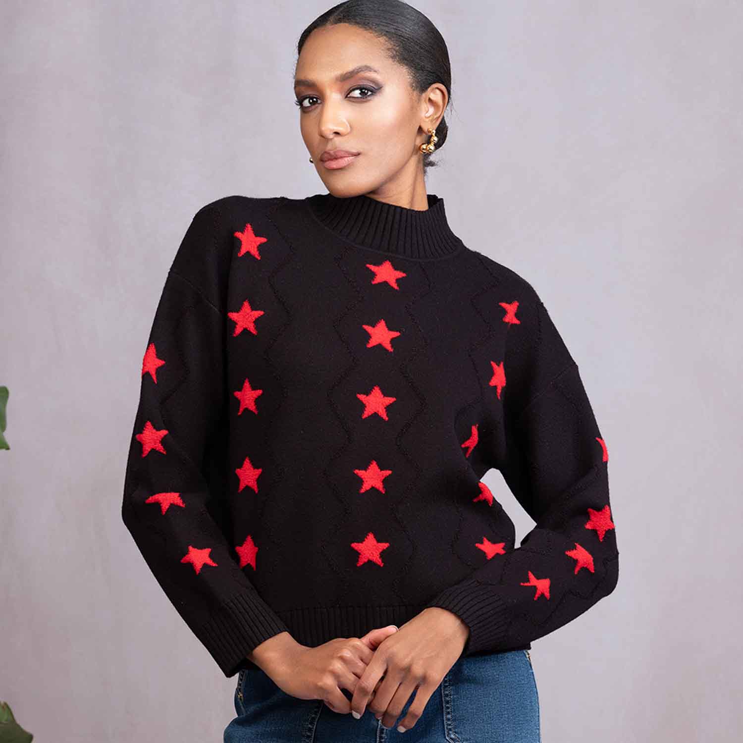 The ALISON SHERI Red Stars Sweater in Black offers a striking contrast with its bold red star pattern against a classic black backdrop. Designed with long sleeves, a ribbed collar, and matching cuffs, this piece blends comfort with a touch of statement style – perfect for elevating your everyday wardrobe with ease.